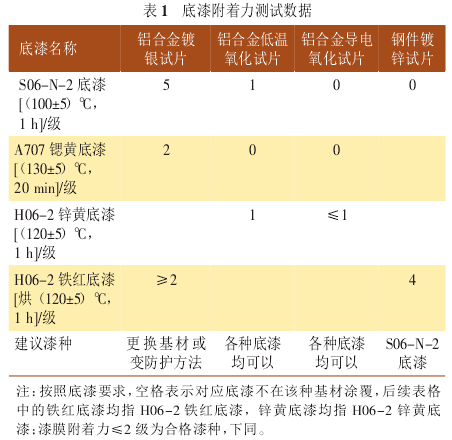 本次试验首先测试了各种底漆在不同基材上的附着力,测试结果见表1。由试验可以看出,镀银试片比较光滑,各种漆膜在镀银层上的附着力都不是很好,建议设计将铝件的镀银改变为其他镀种;表中的各种底漆在低温氧化、导电氧化试片上的附着力都很好,均能满足某单位产品要求;钢件镀锌表面由于有一层钝化膜,该层钝化膜在高温加热时,附着力明显变差。如果钝化膜不去除,S06-N-2底漆的附着力优于铁红底漆的附着力。未高温烘烤前,钝化膜附着力为0级,喷完底漆后,进行烘烤,高温烘烤后,钝化膜附着力明显变差,做划格试验,漆膜连同钝化膜一起脱落。